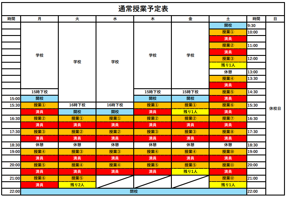 ※現在の空いているコマは黄色の枠のみとなっております。